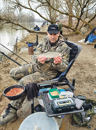 ZAMEŠAO SAM DOKAZANO LOVNU kombinaciju od jednakih delova Gica Mix brašnastih prihrana Mr Barbel Skobalj i River Winter. Naravno, vodio sam računa o tome da bude onakva kakva skobalju odgovara – malo »suvlja«, to jest ne previše navlažena. U smesu sam nakon prosejavanja dodao Gica Mix pelete od 2,5 mm, sa aromom sira, a hlebne mrvice i mesne crviće koje sam udavio u vodi sam dodavao u hranilice po potrebi – »odokativno«.