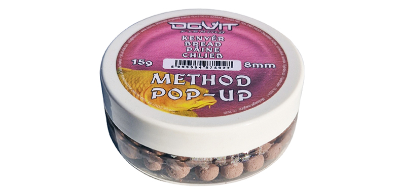 Method Pop-up bojliji, kao i svi drugi, montiraju se na dlaku ili trn odgovarajuće dužine, ispod udice, a za one od 8 mm, po proizvođačkoj specifikaciji, optimalan je trn dužine 7 mm i standardna šaranska udica veličine 12 ili 14. Ovog puta vam posebno skrećemo pažnju na novi bojli u toj paleti, sa aromom hleba (mađ. Kenyér, eng. Bread), dokazano neodoljivom za razne vrste ciprinida. On je svetlobraon boje i dostupan samo u veličini od 8 mm, u teglicama od 15 g, koje se po maloprodajnoj ceni od 480 dinara mogu kupiti preko internet prodaje www.mozaikcentar.com (uz dostavu brzom poštom) ili u radnji Mozaik Centra u Žablju (Nikole Tesle 35, tel. 064/646-56-83), kojoj se i zainteresovane prodavnice mogu obratiti radi dobijanja informacija o veleprodajnim cenama.